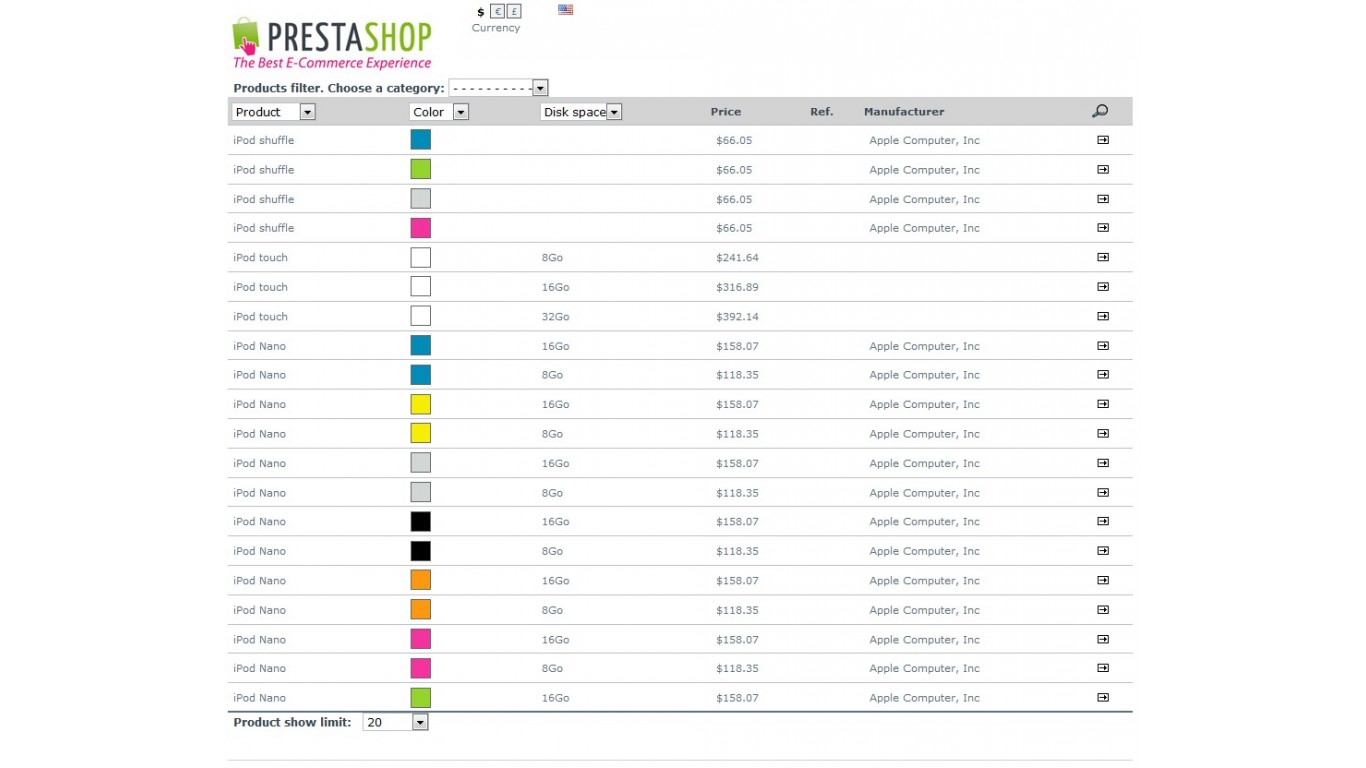 v1.0.0 (2010-01-09) + first release for PrestaShop 1.3 v1.2.0 (2012-07-05) + added support PrestaShop 1.4 + added column to display manufacturer v1.3.0 (2012-08-20) + now when a customer click to product combination it redirects to a product page with same attributes + improved styling v1.4.1 (2012-11-25) + code reformat and optimization