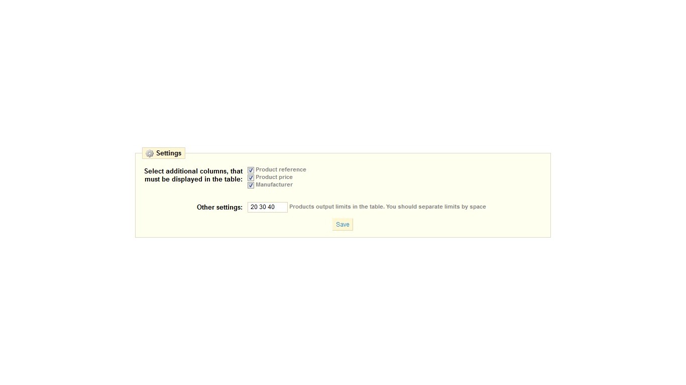 Allows you to filter all catalog products and display them in a table.